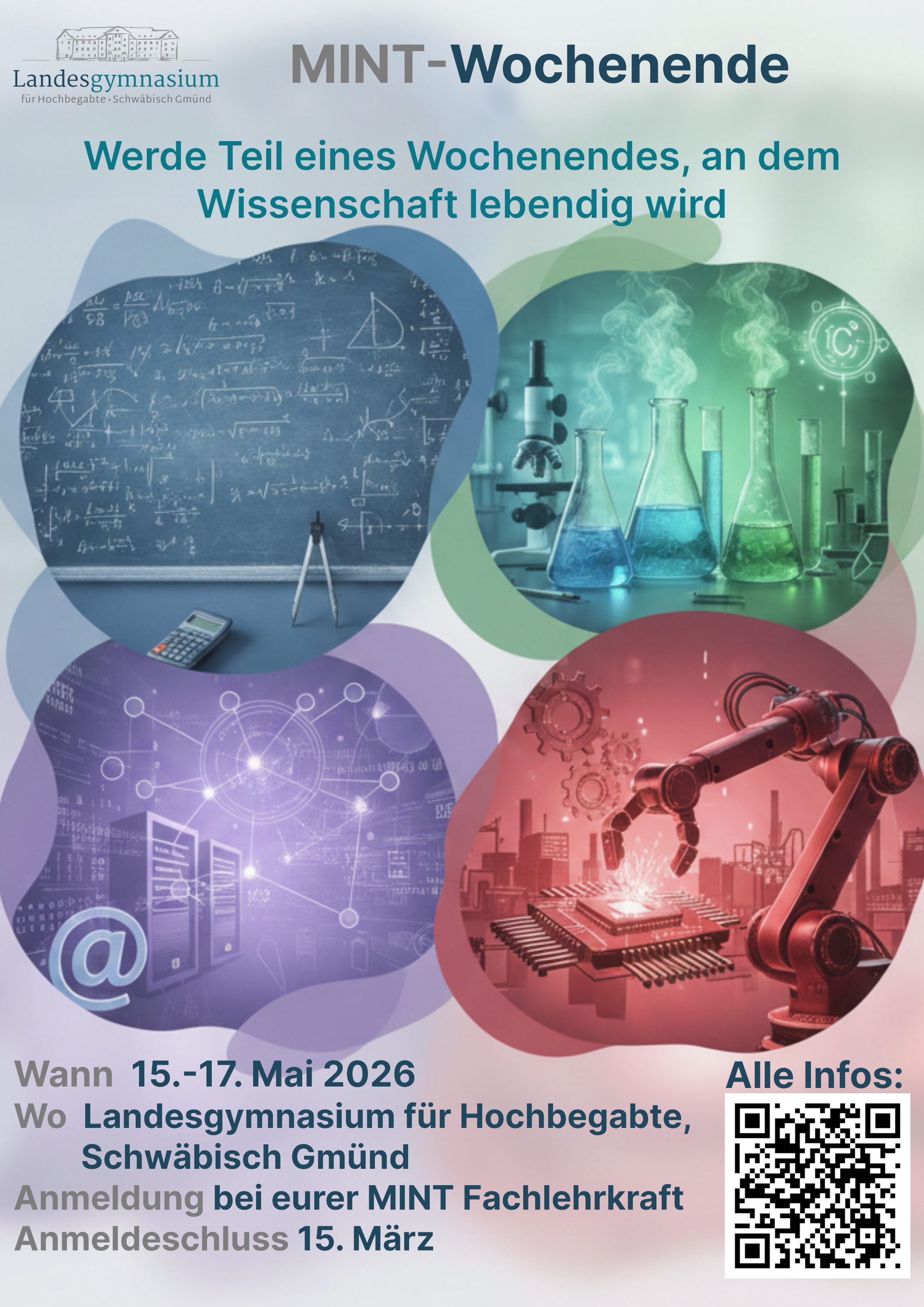 Vom 15.-17. Mai 2026 findet am Landesgymnasium für Hochbegabte ein MINT-Wochenende statt. Ziel des Wochenendes ist es, neben einem MINT-Fach auch andere Schülerinnen und Schüler mit ähnlichen oder komplementären Interessen kennen zu lernen und Freundschaften zu knüpfen.